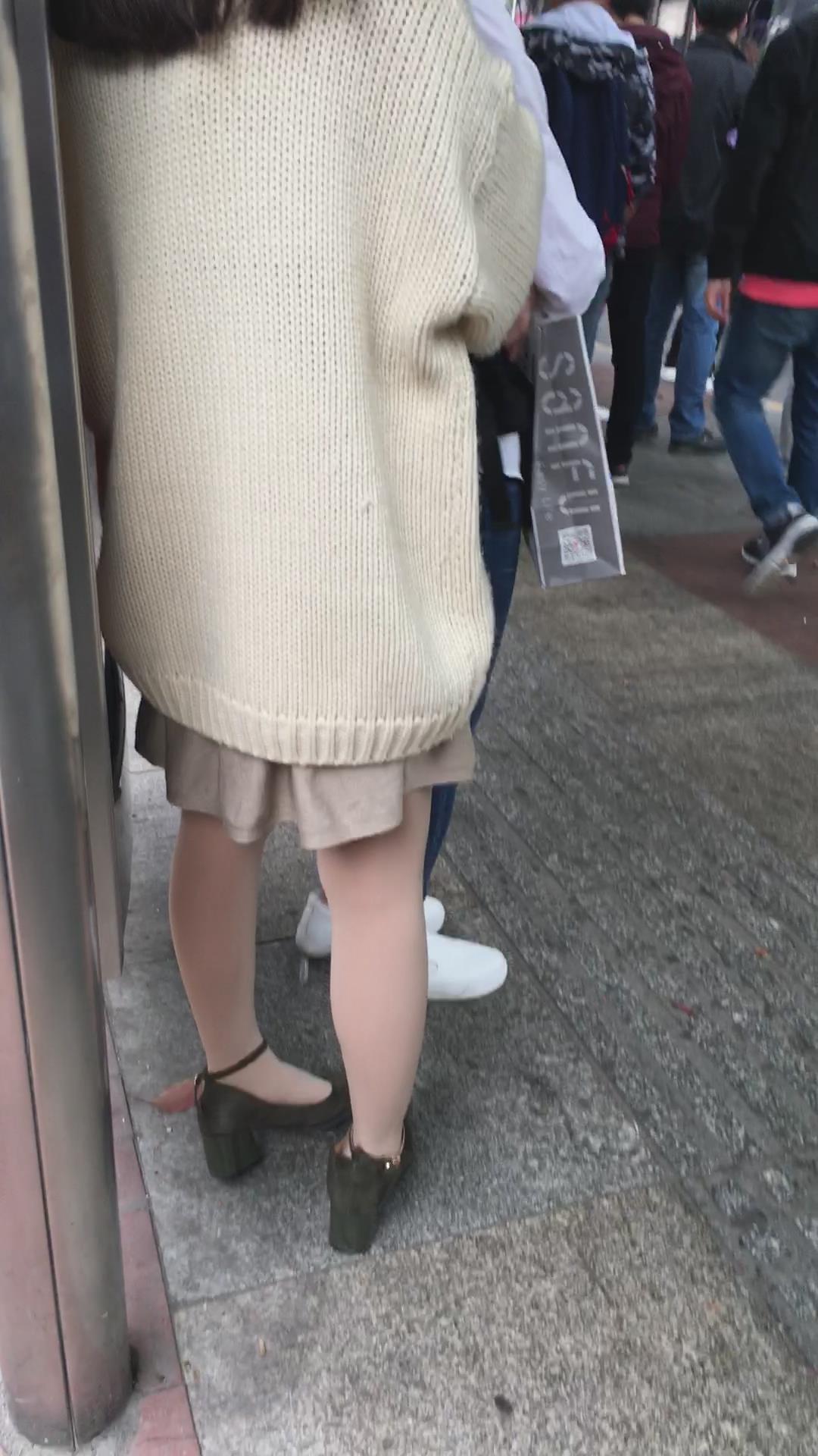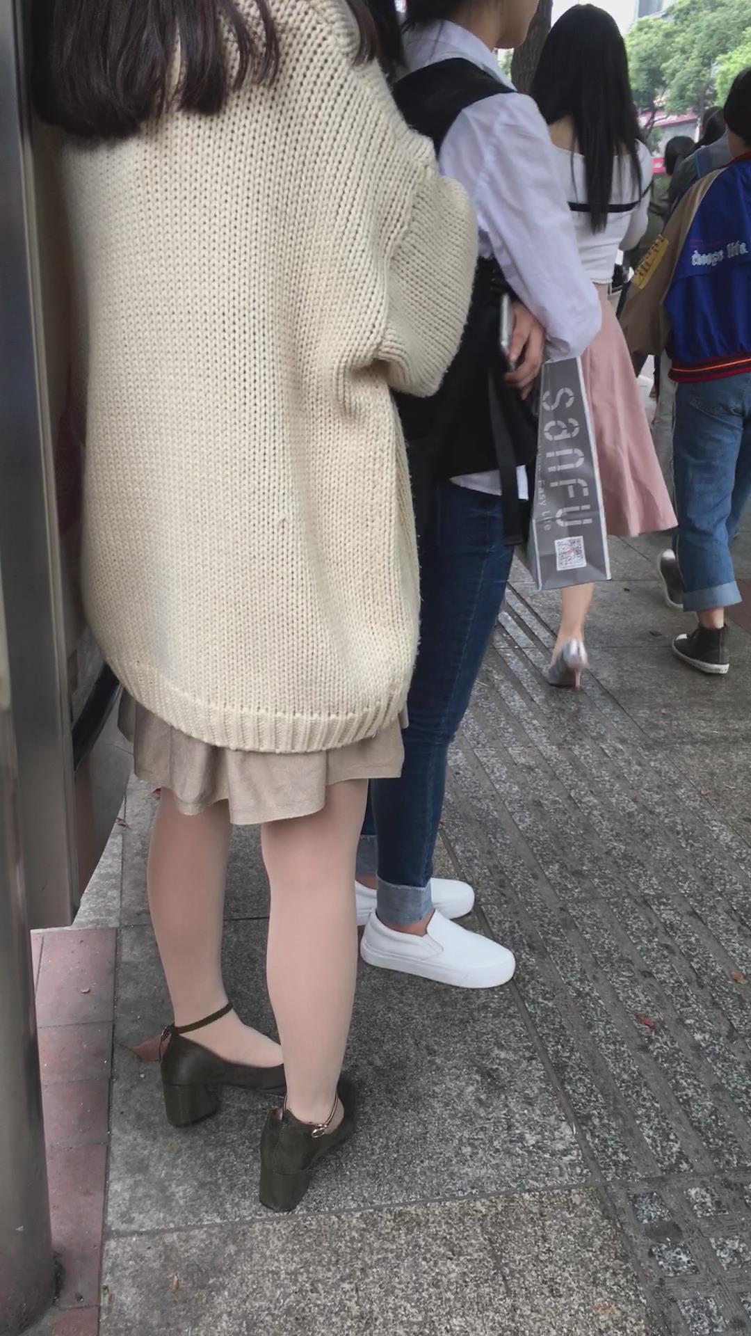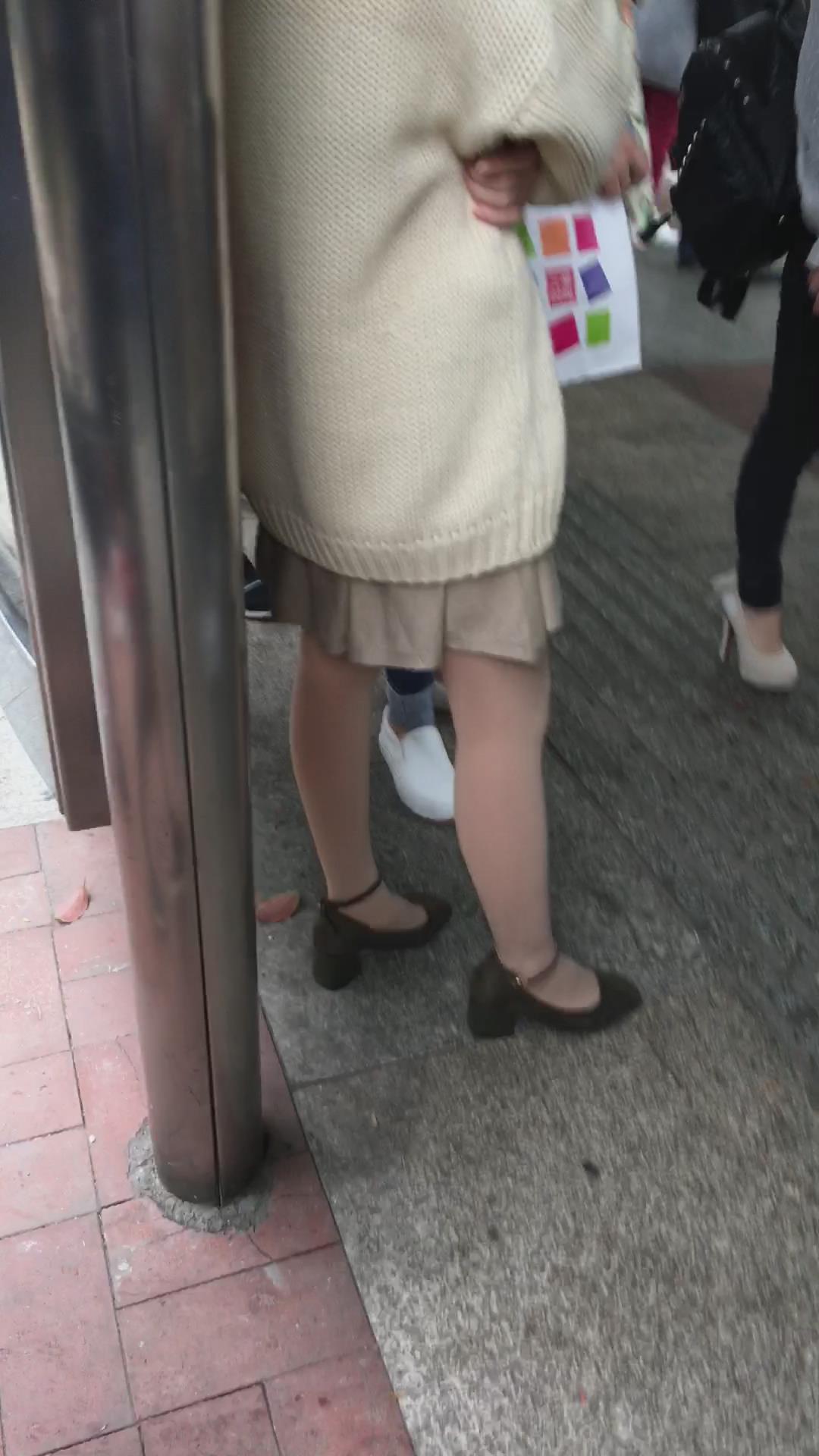 街拍公交站等车的米色毛衣短裙丝袜街拍美腿 编号2139