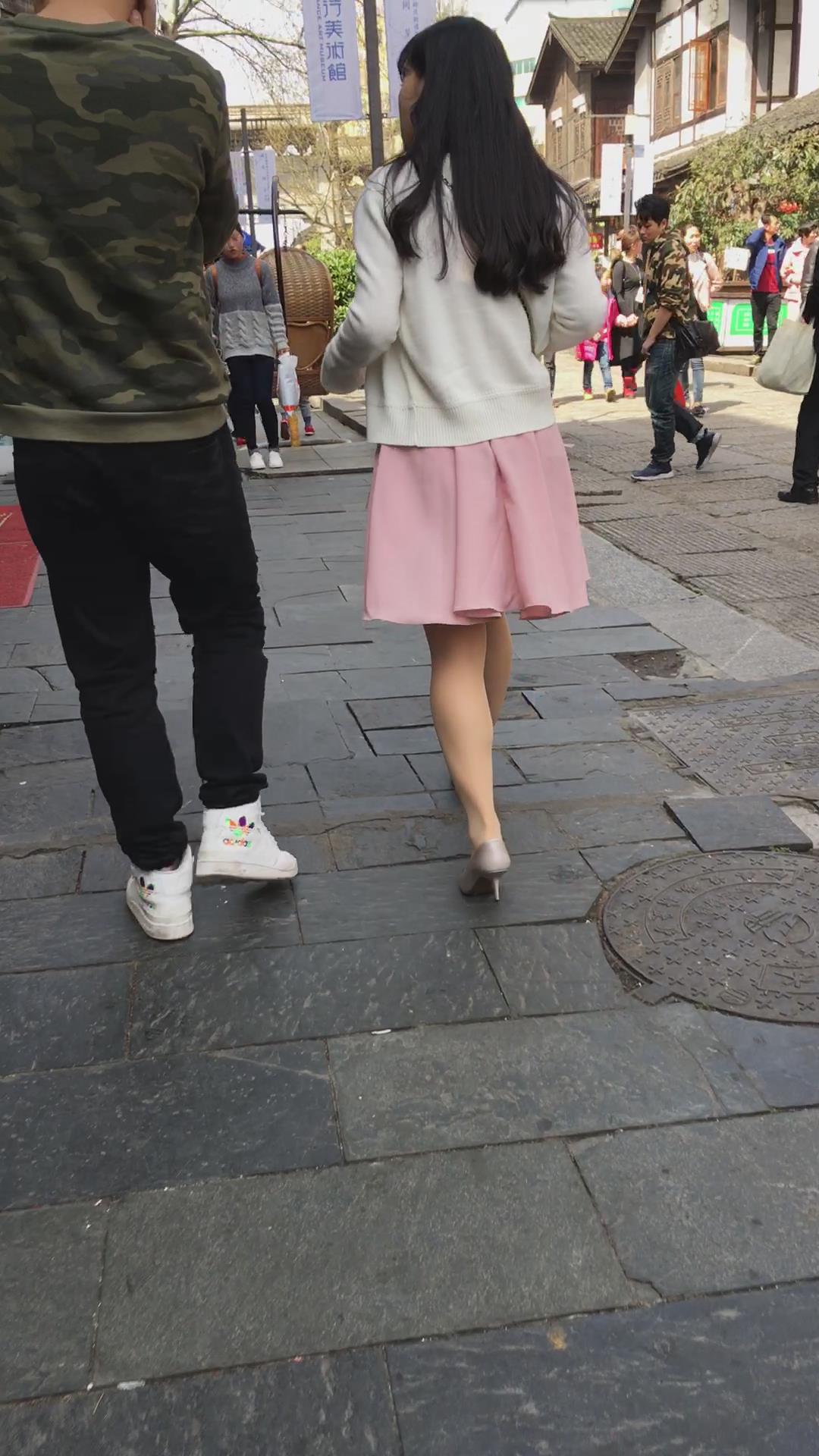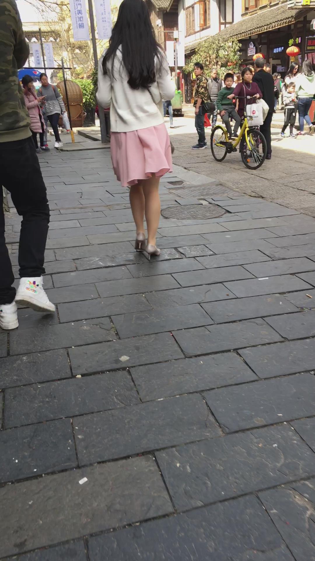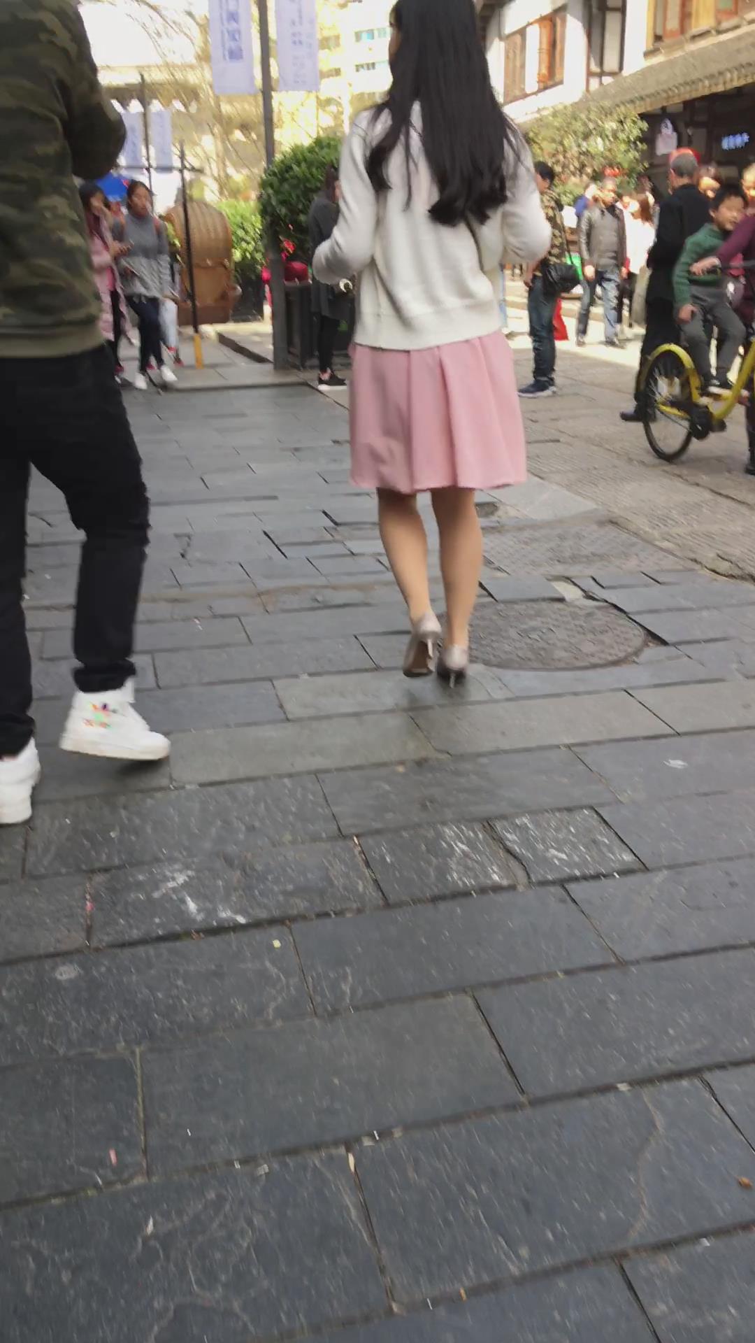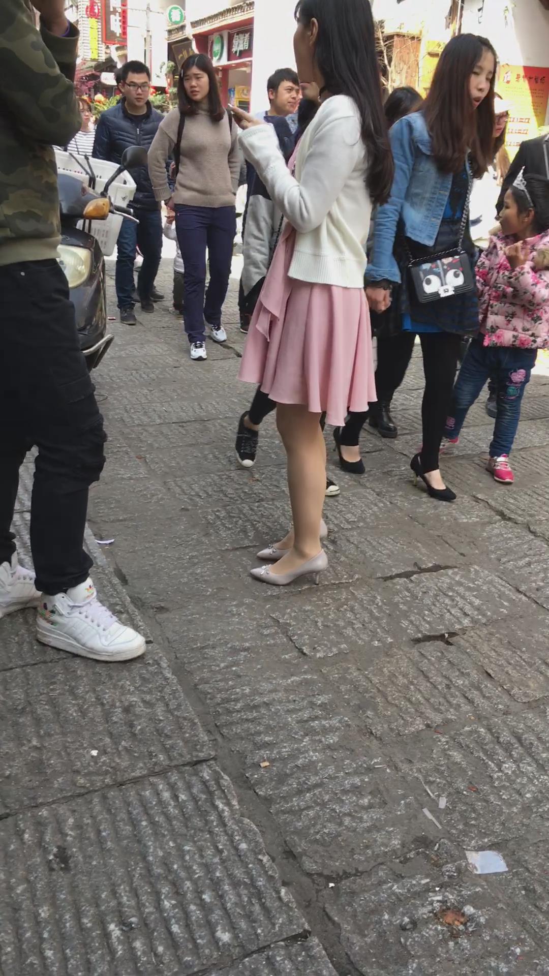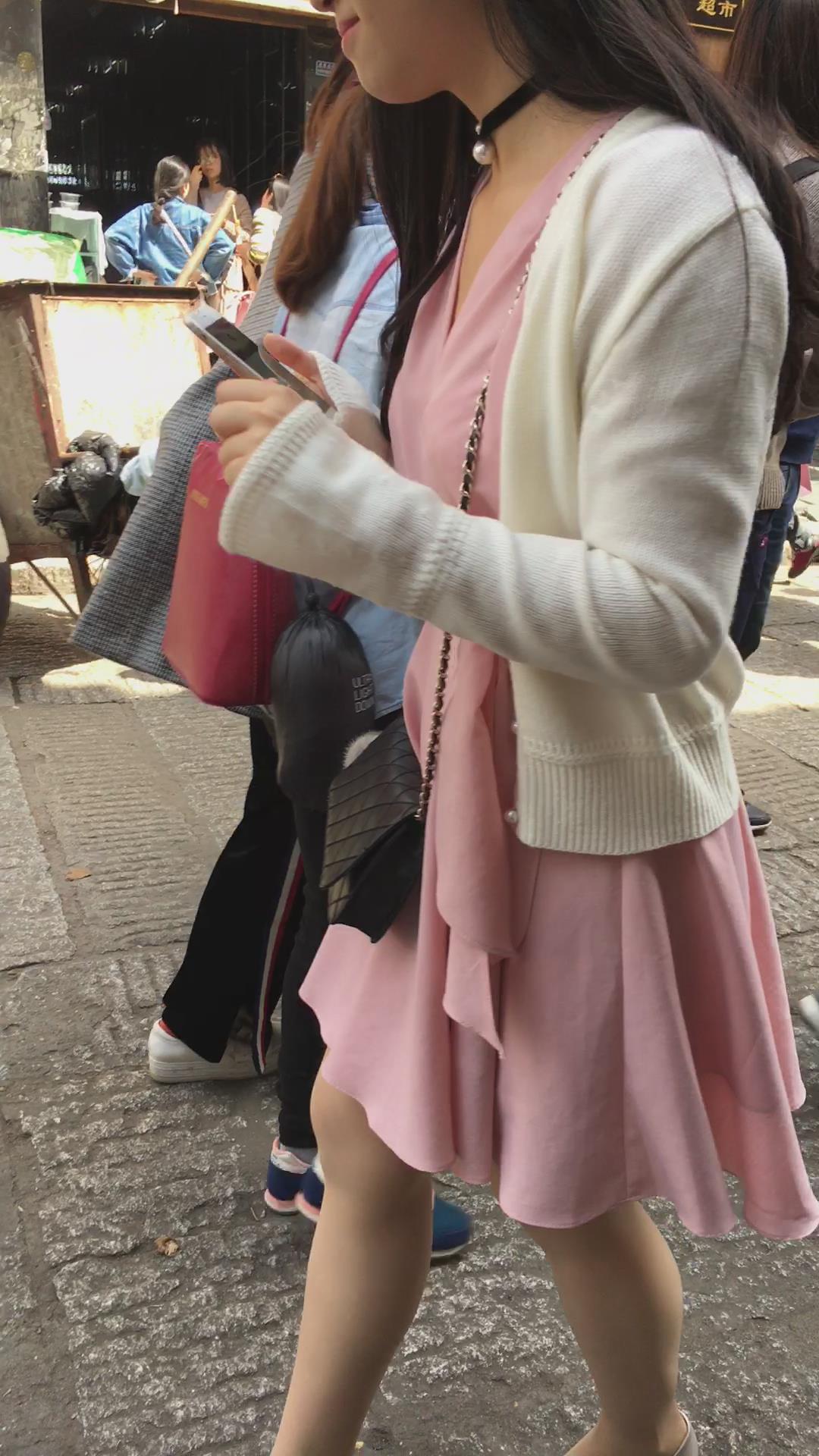 粉色连衣裙白色针织衫高跟鞋街拍美女视频 编号2156