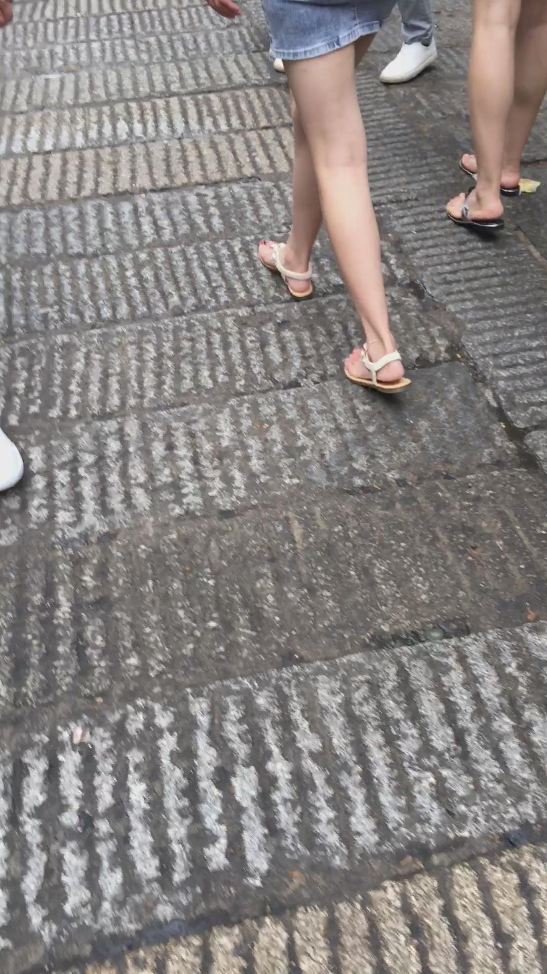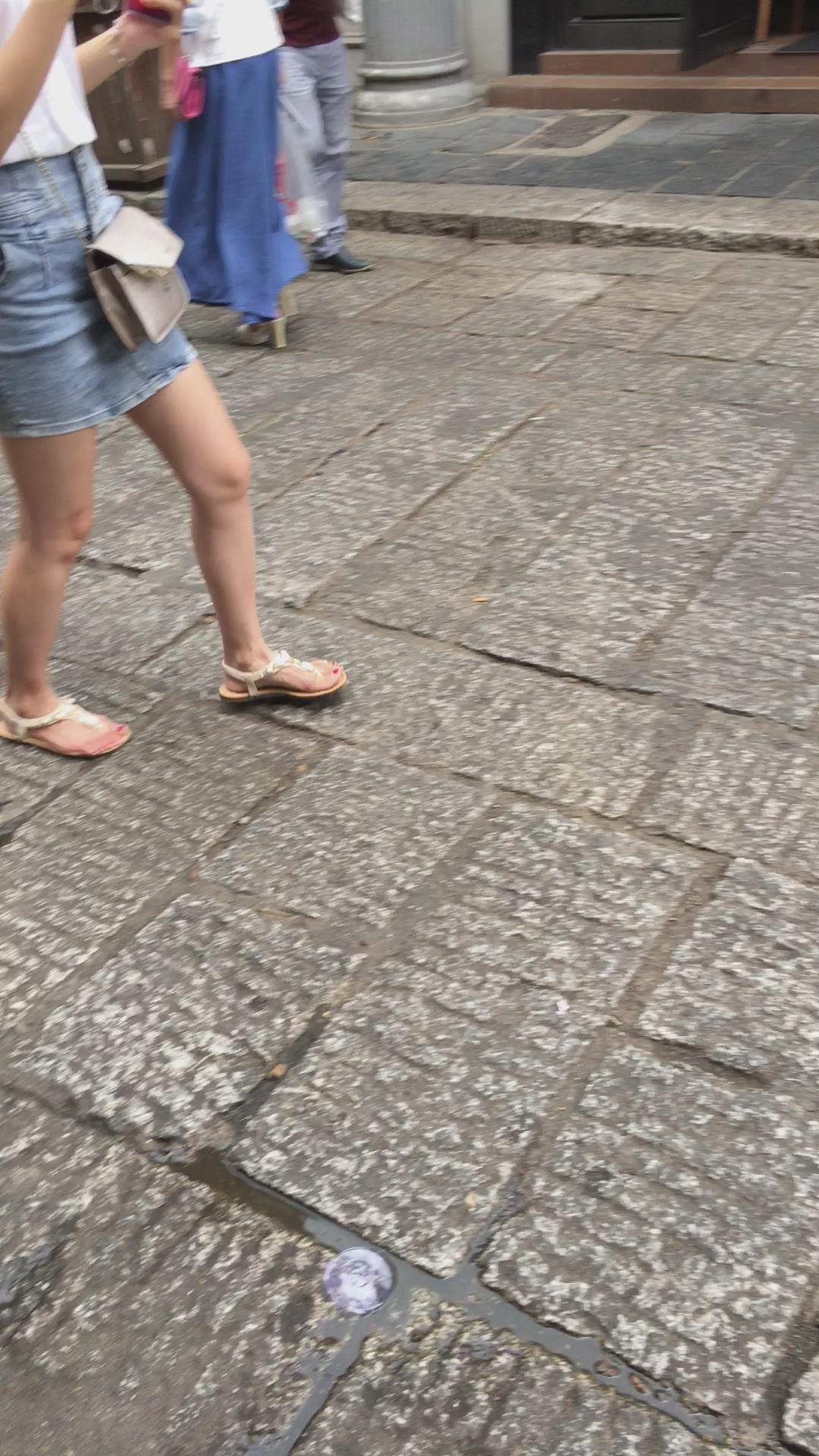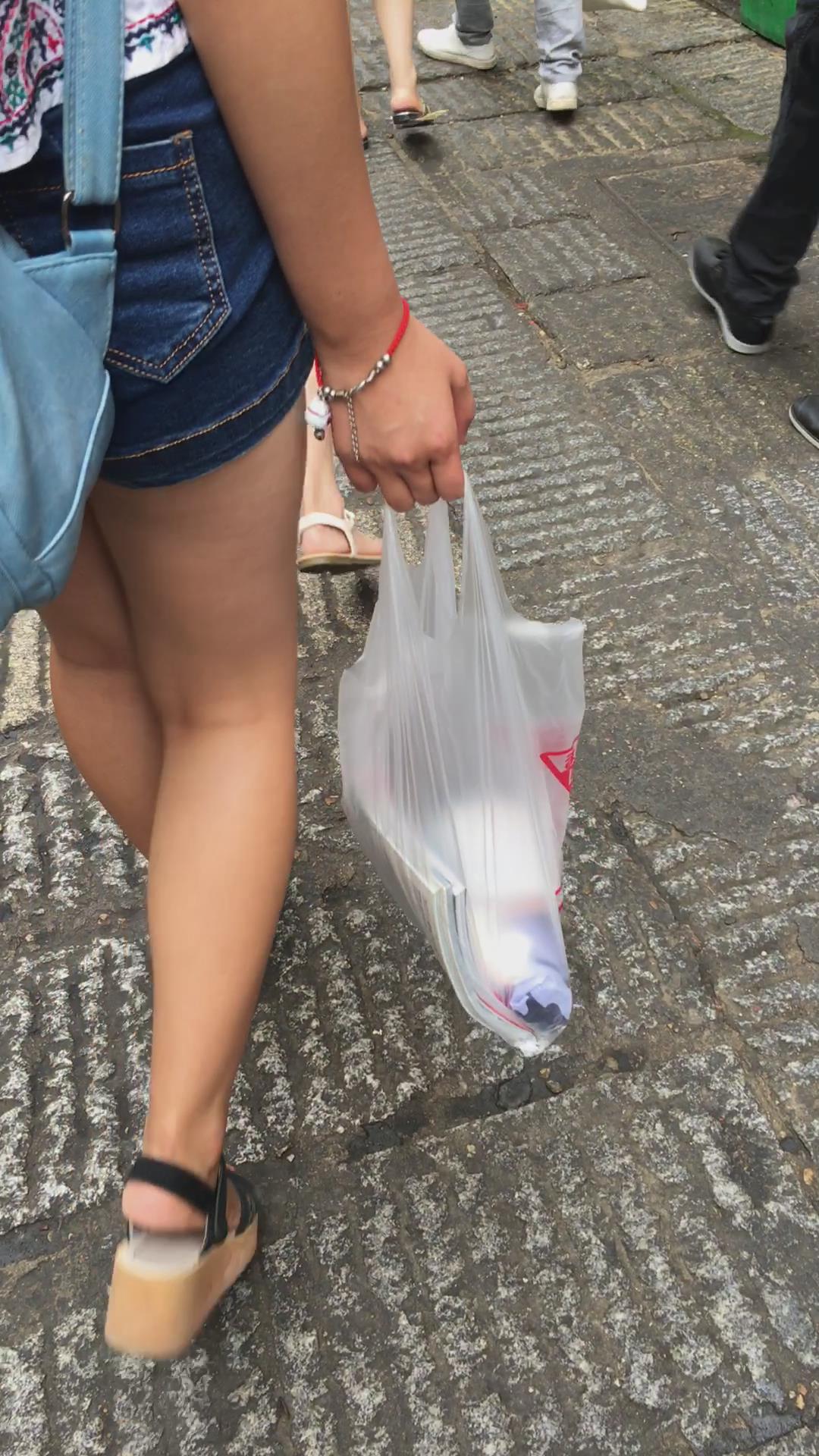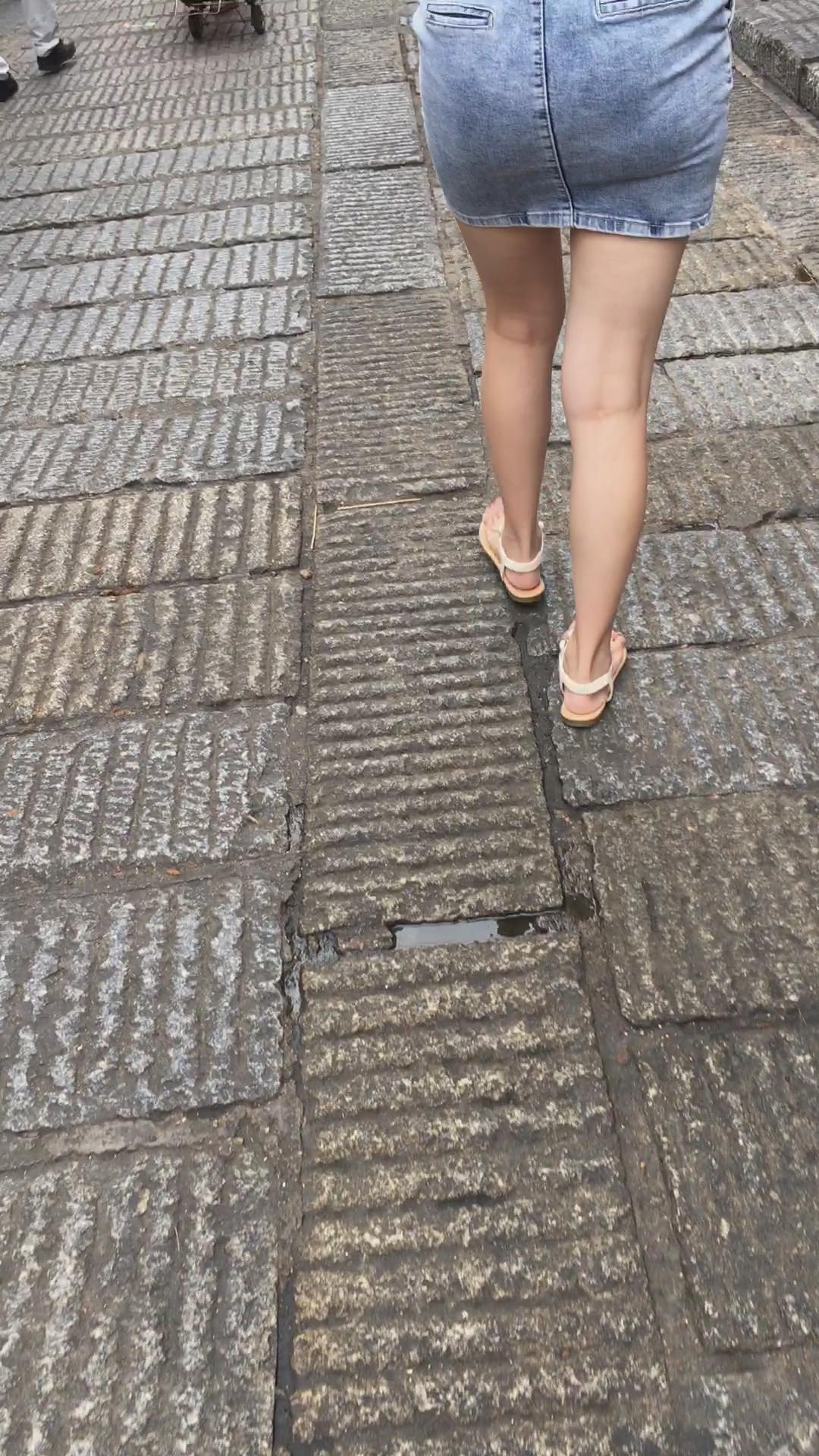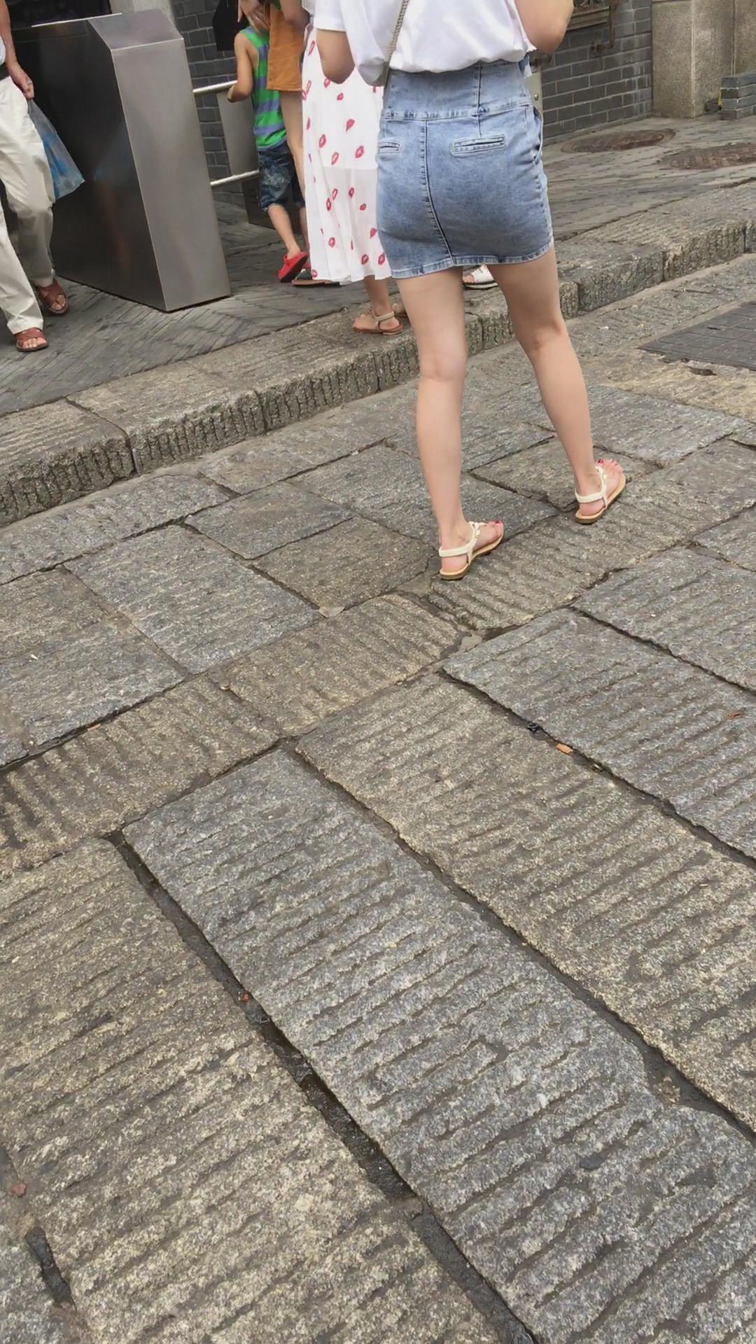 街拍牛仔短裙白T恤娇小身材可爱小美女 编号2181