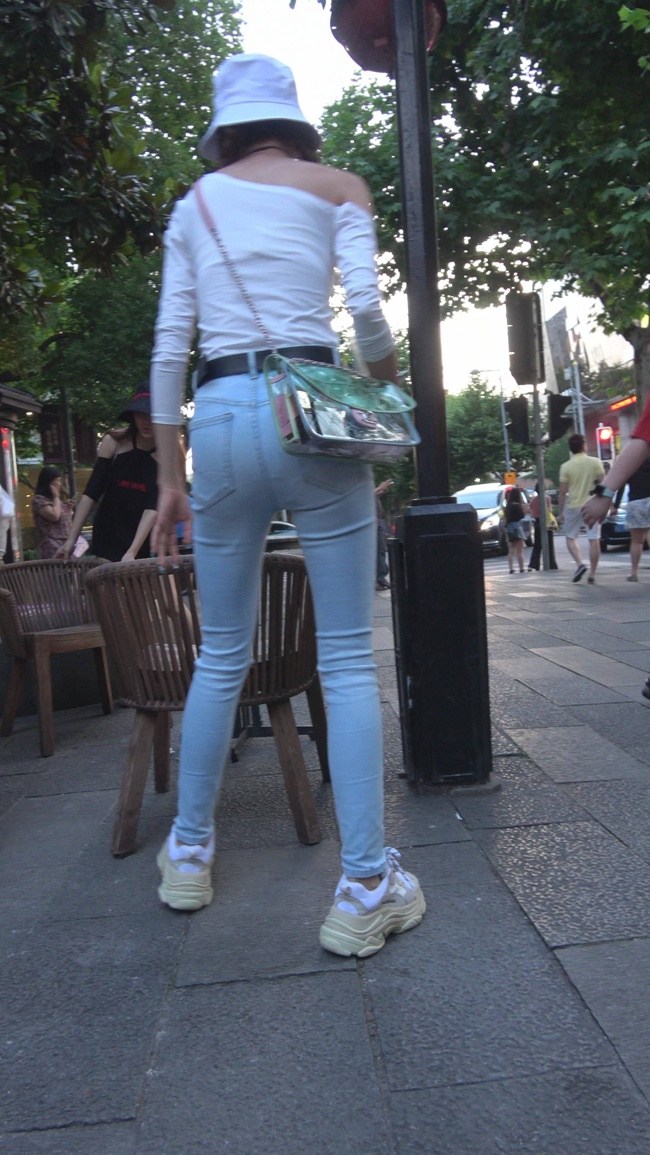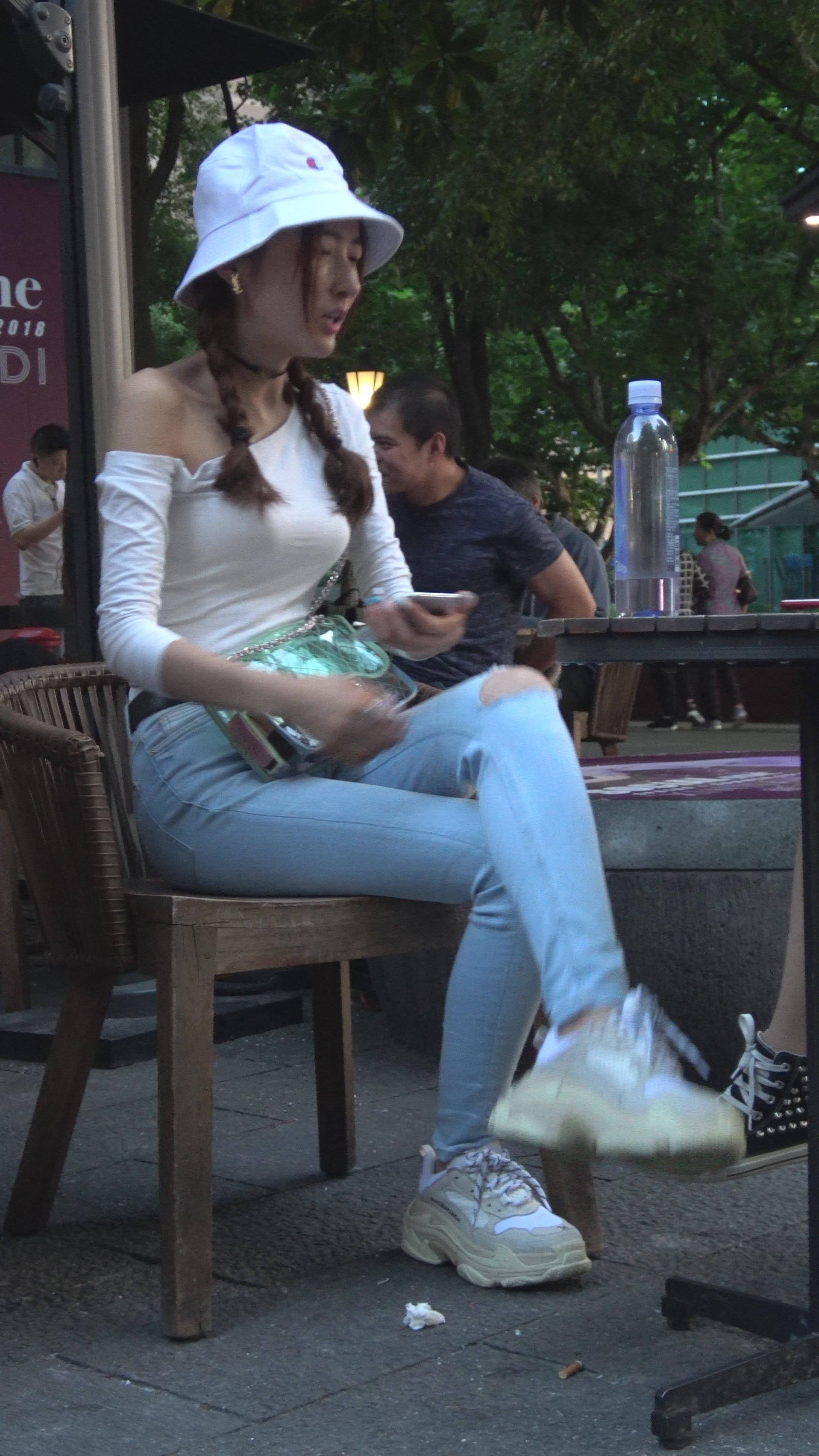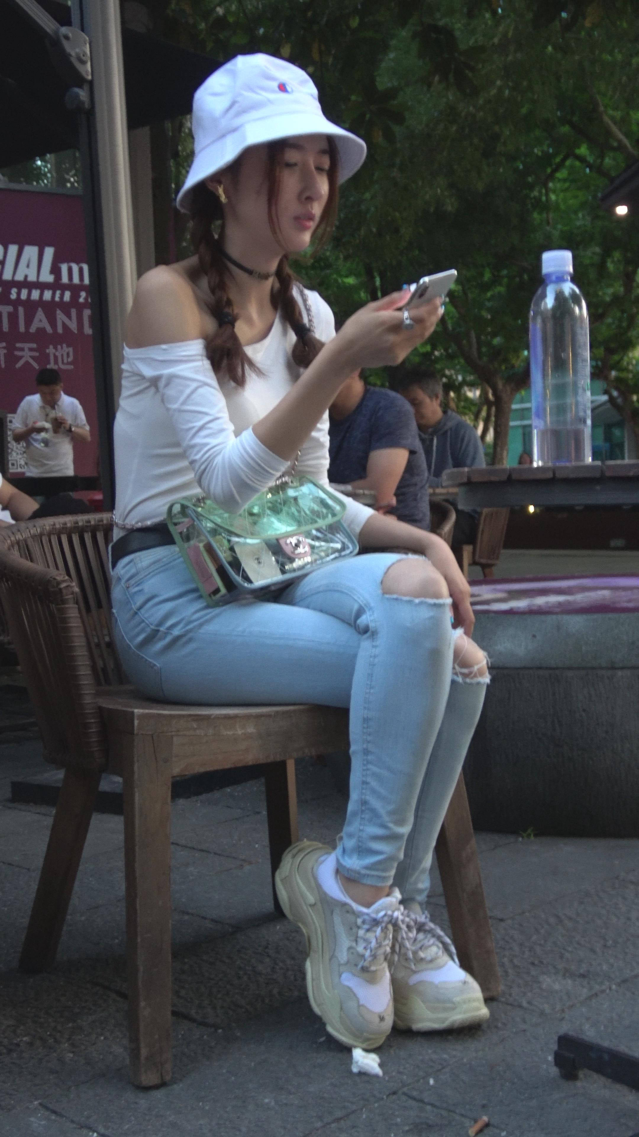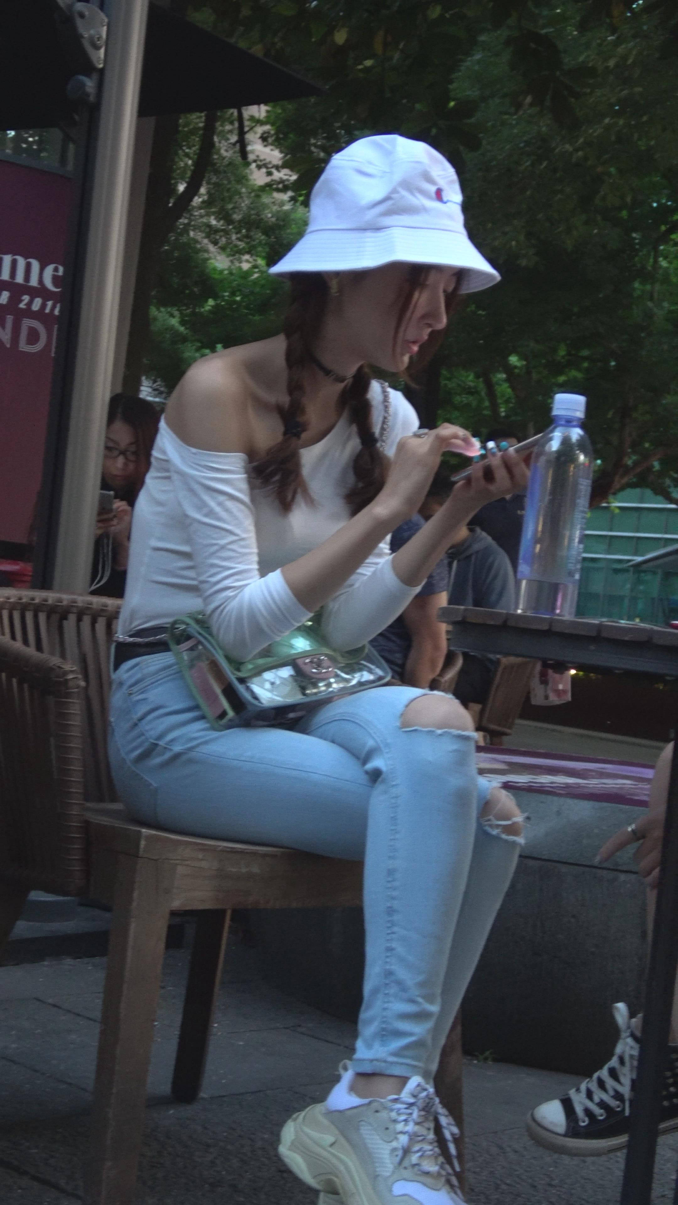 4K 破洞牛仔裤露肩小清新街拍美女 编号7969