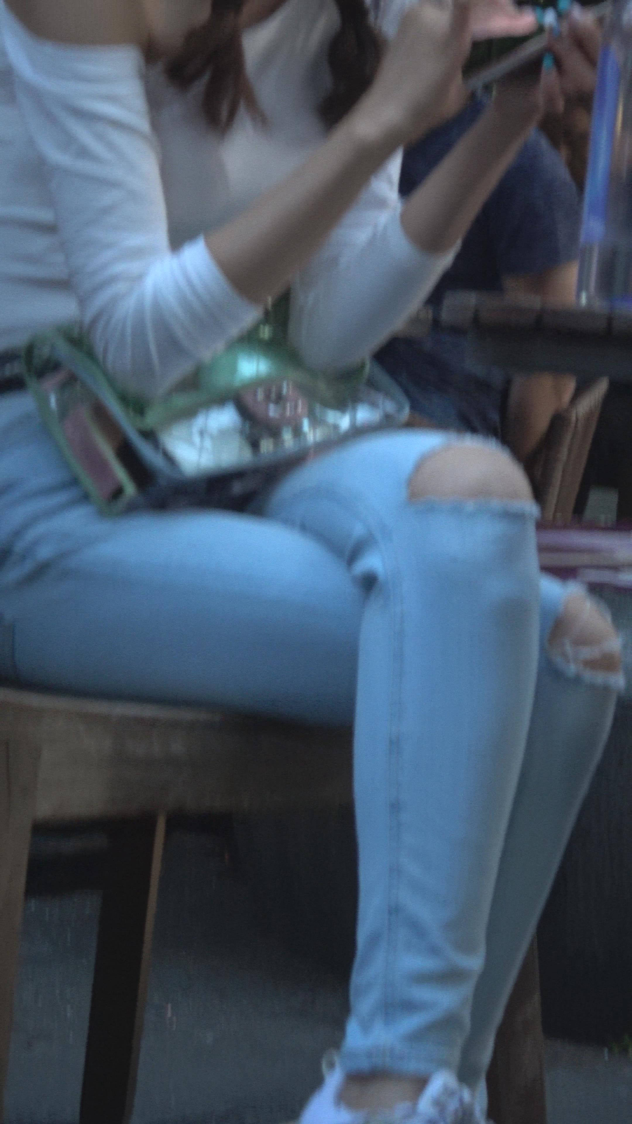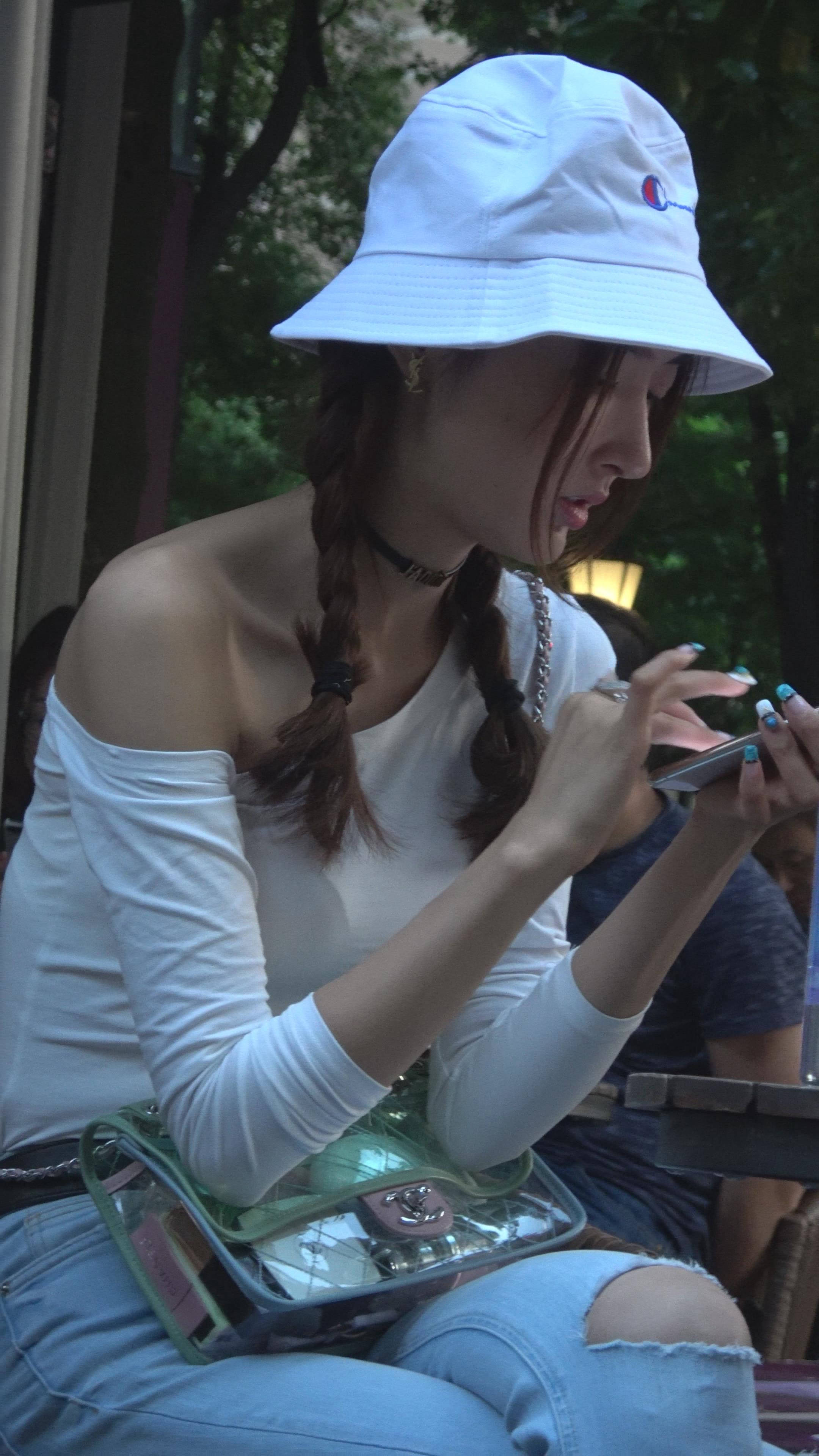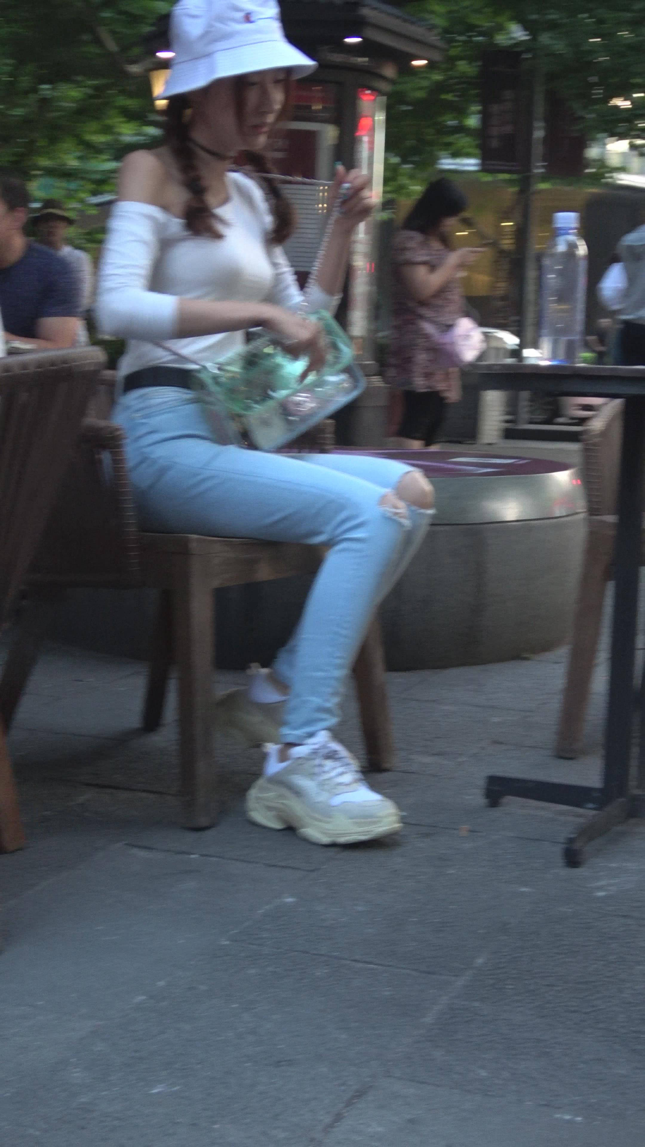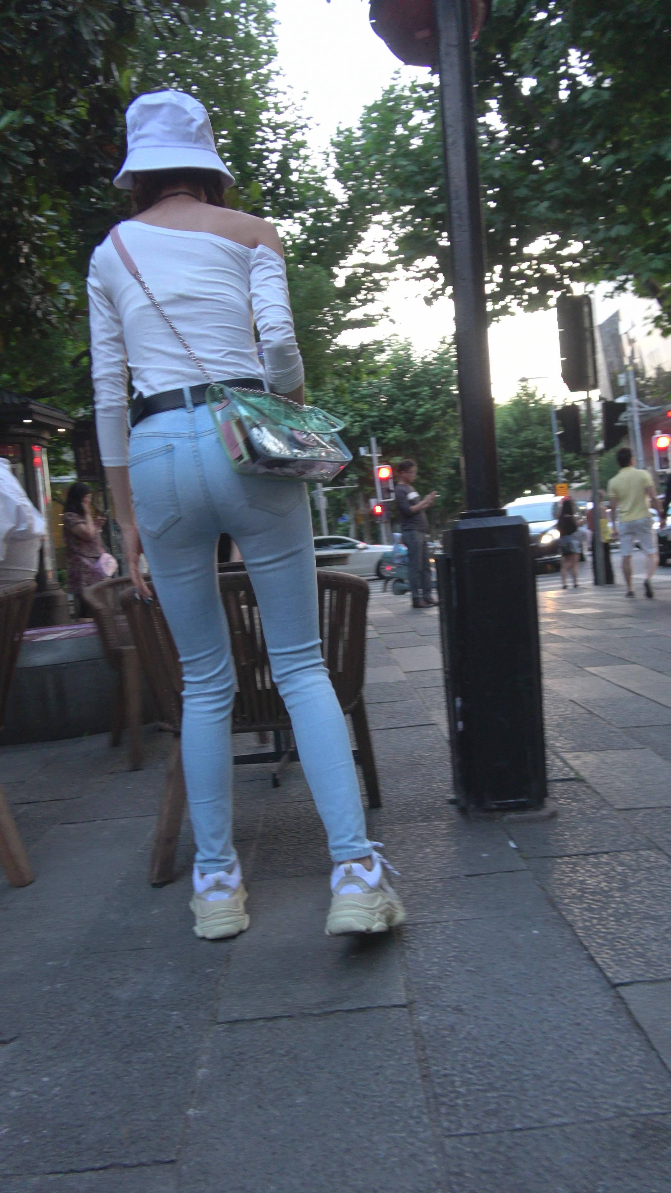 4K 破洞牛仔裤露肩小清新街拍美女 编号7969