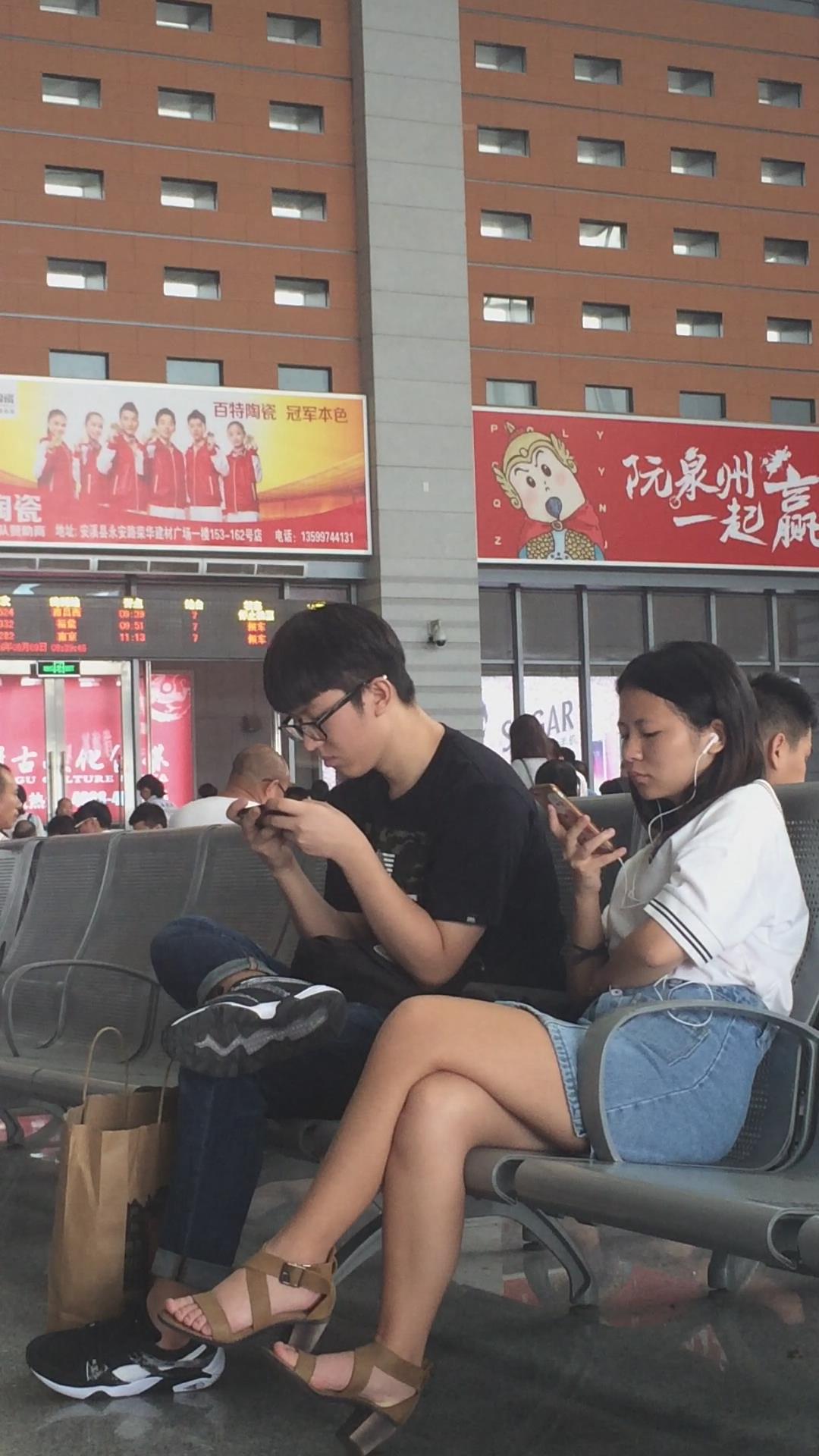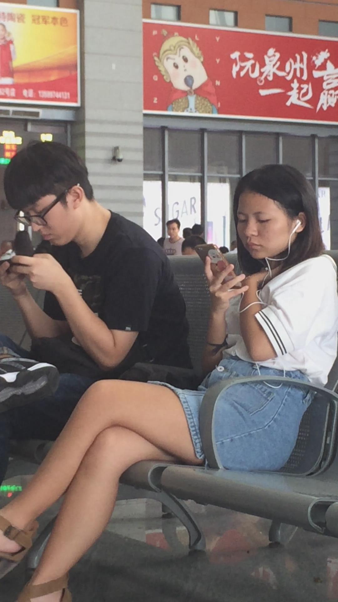 高铁站候车室等车的美腿牛仔裙美女 编号2337