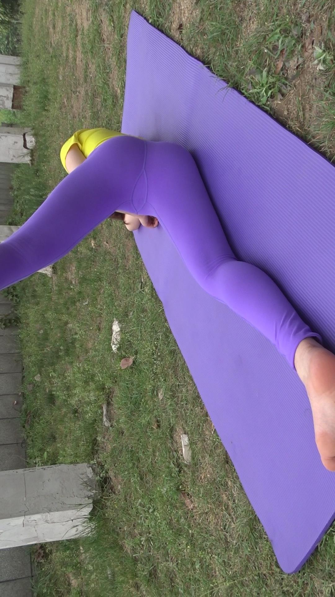 黄T恤紫色紧身瑜伽裤饱满三角区美女外拍视频 编号6805