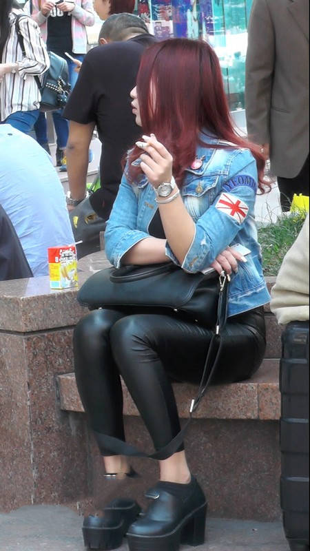 【编号1105】街拍黑色紧身皮裤露脐女孩