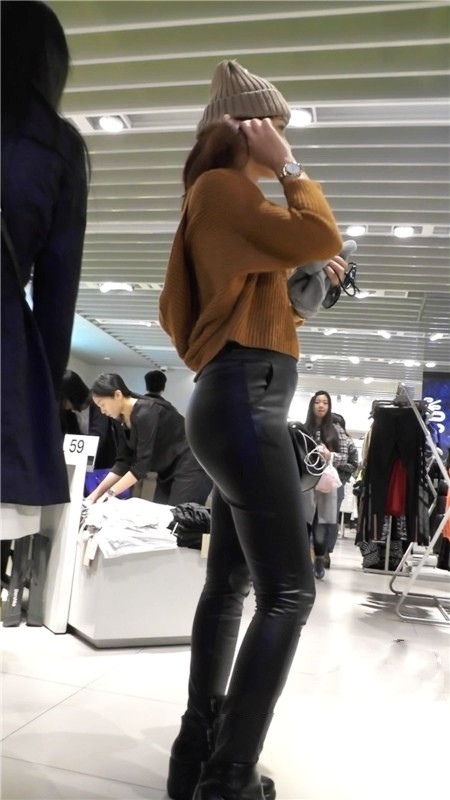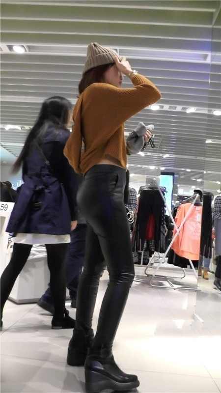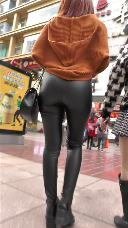 【编号1180】街拍黑色紧身皮裤美女浑圆的翘臀