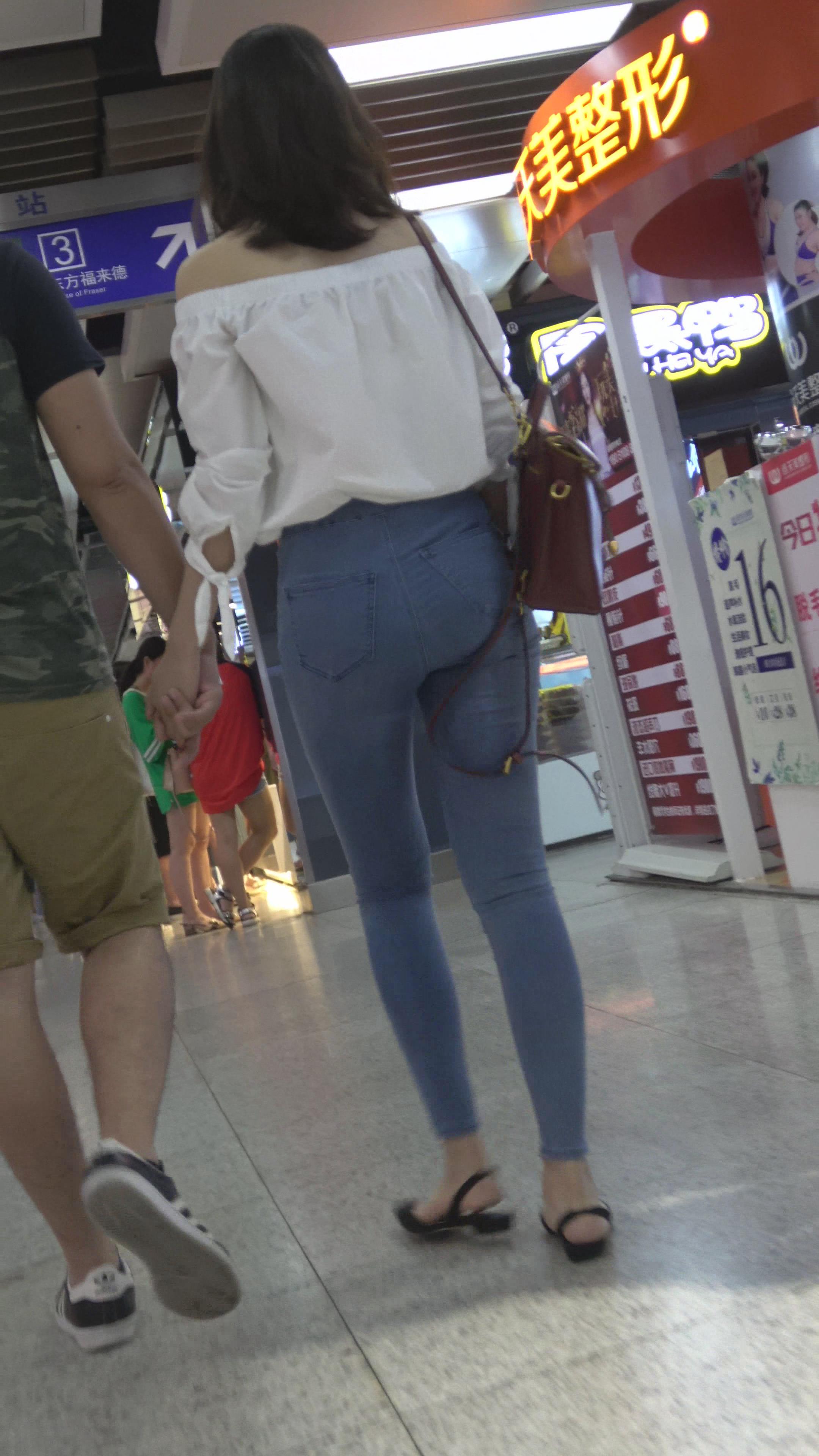 4k-高颜值紧身蓝色牛仔裤女神姐姐,美臀太紧啦 编号3123