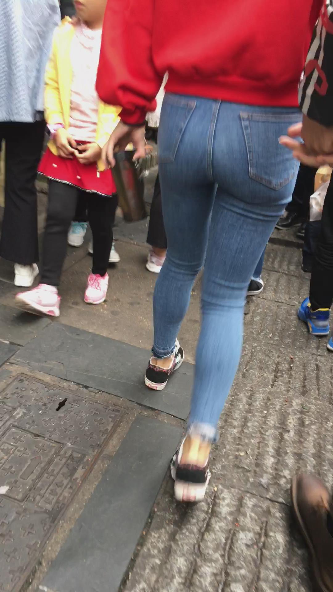 极度紧绷蓝色牛仔裤红衣服街拍美女 编号5337 |