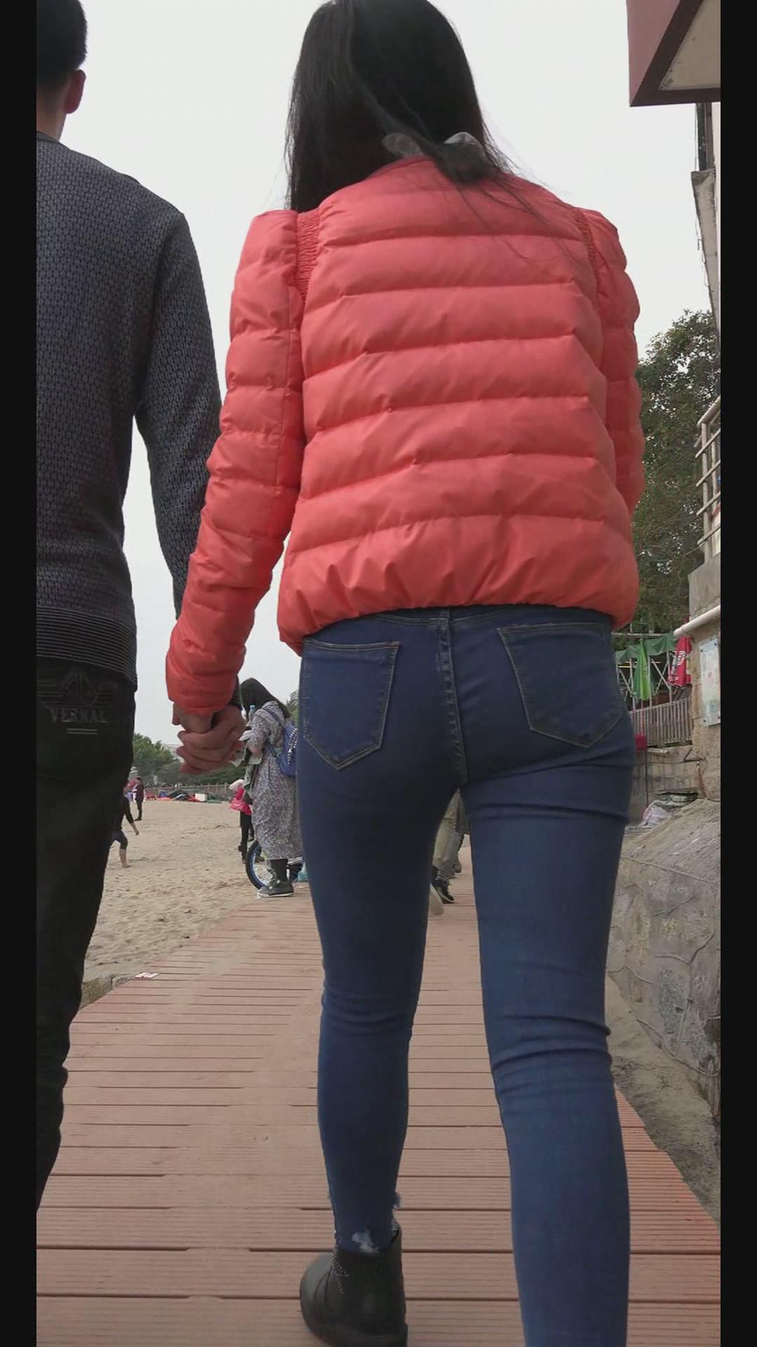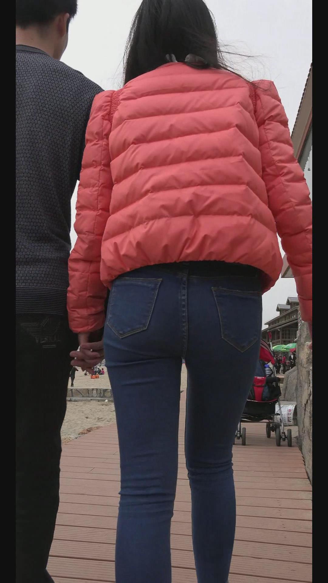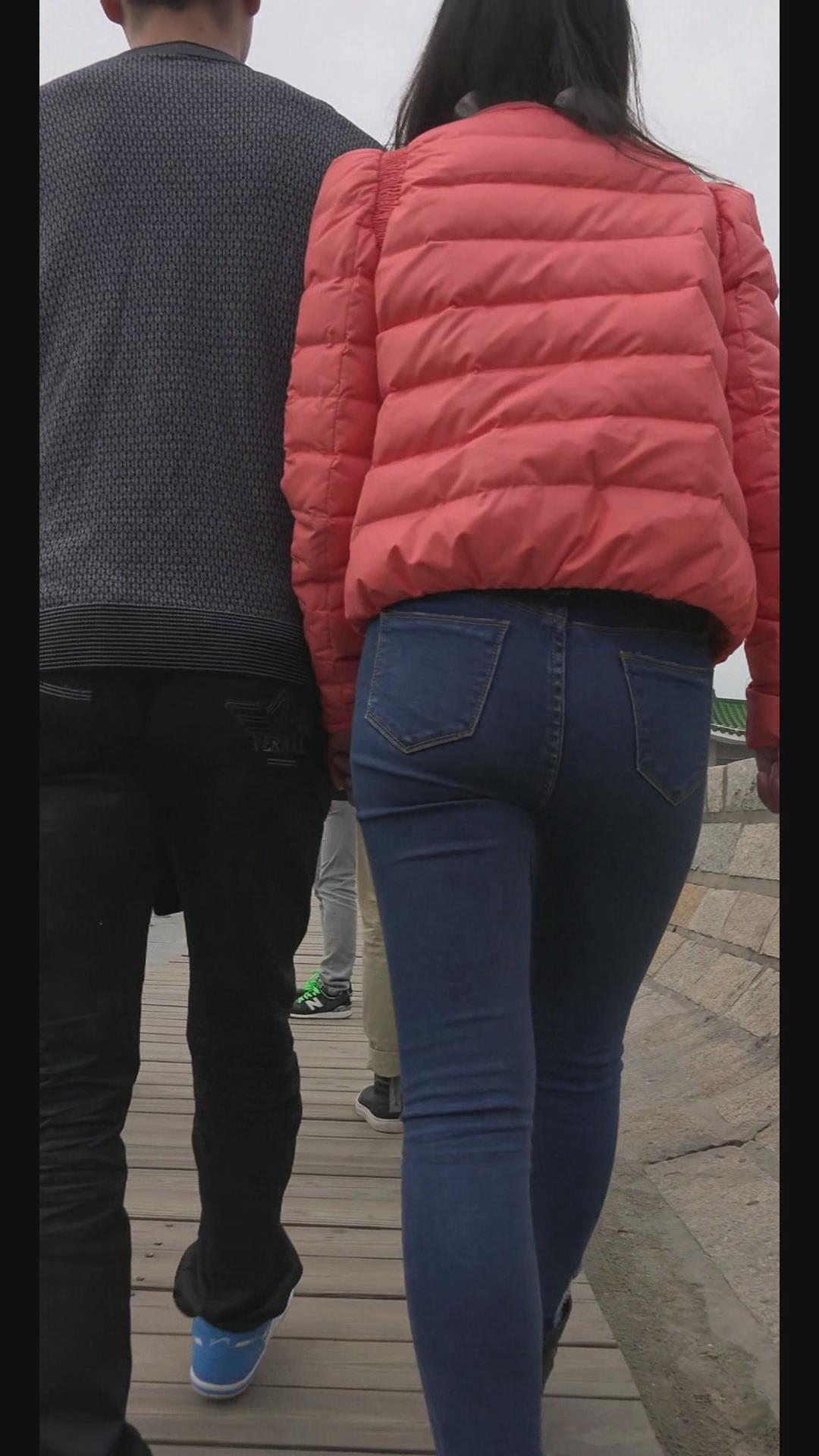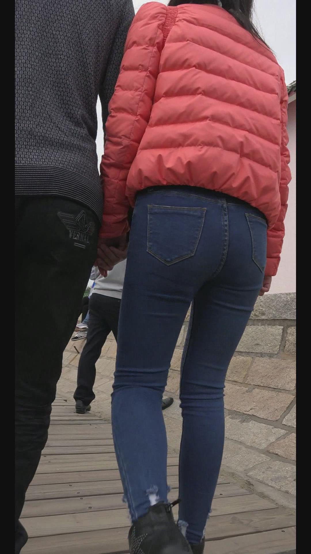 街拍蓝色紧身牛仔裤粉衣少女 编号5963 |
