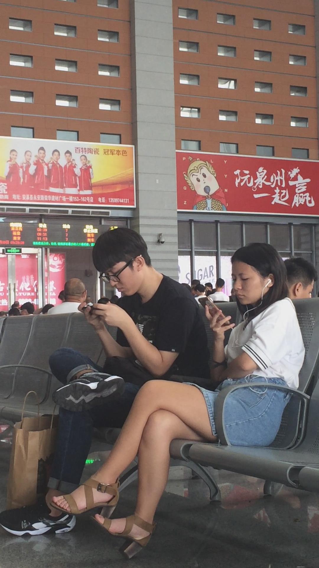 高铁站候车室等车的美腿牛仔裙美女 编号2337 |
