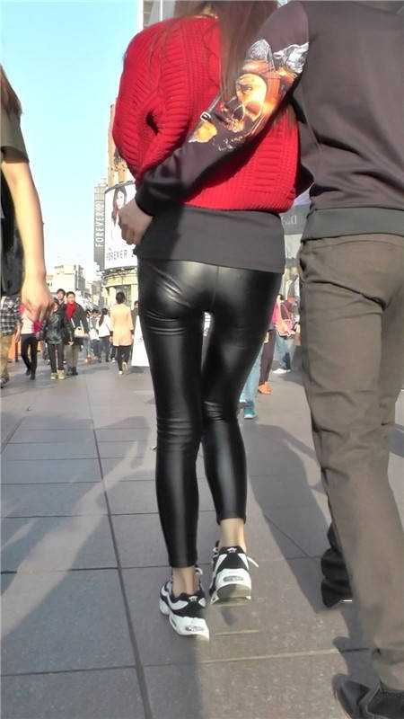 【编号1084】街拍紧身黑色皮裤苗条女生与男友逛街 |
