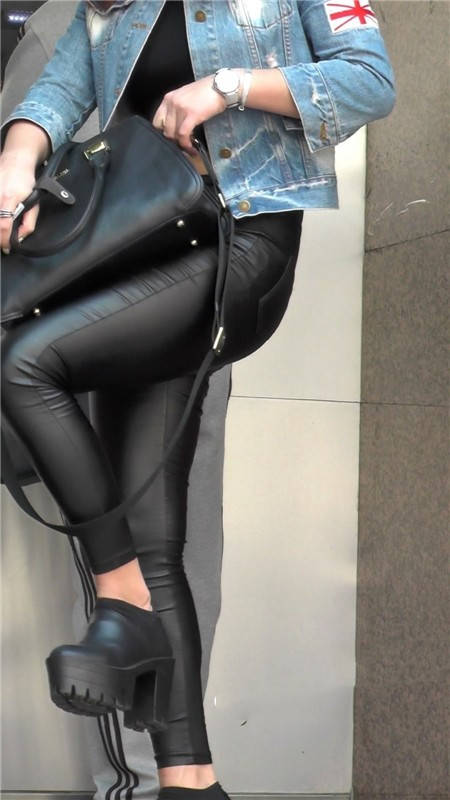 【编号1105】街拍黑色紧身皮裤露脐女孩 |